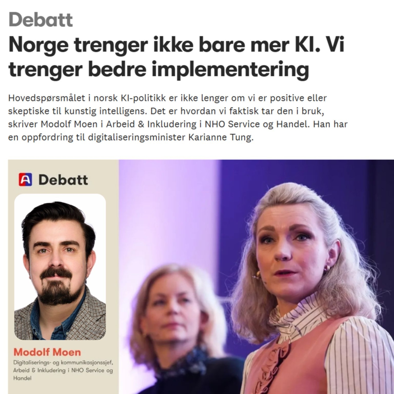 Moen peker i Altinget på at de avgjørende spørsmålene ikke først og fremst er teknologiske, men handler om styring, personvern, forklarbarhet og menneskelig kontroll. Dette er noe vi i Arbeid & Inkludering har gjort og fortsetter å gjøre i praksis med utviklingen av Klara.ai.